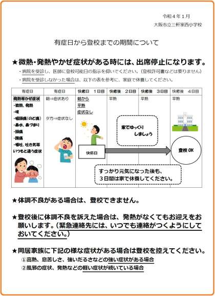 引き続き、健康管理にはご留意いただき、朝、体調がすぐれない場合は、学校まで必ずご連絡いただきますようにお願いいたします。また、風邪様症状が見られるときには、医療機関を受診するようにしてください。