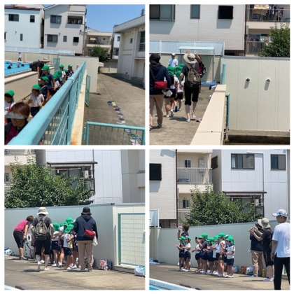 いつもは、運動場ですが、今回は、プール。大きいプールにびっくりする幼稚園のまつぐみさん。