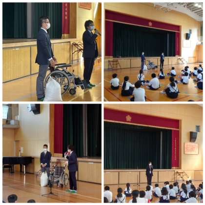 今日の児童朝会は、お祝い会に、プルトップから車いすの話。講堂中があたたかくなりました。