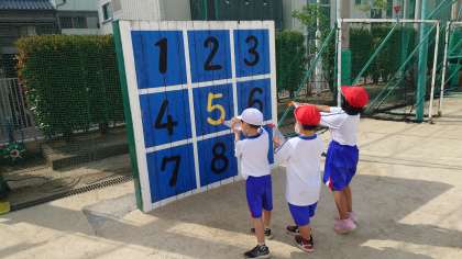 水遊びといっても、水を様々な容器に入れて、どれくらいとばすことができるのかを確かめる遊びです。