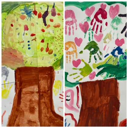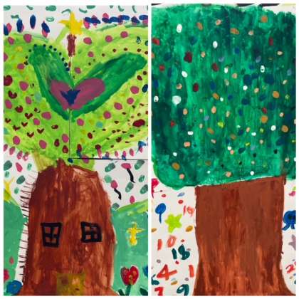 チームで考え、どんな木にしようかと決めて、それを1人ずつが1枚に描いていく。そして、できた4枚を合わせる。