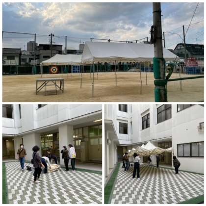 テントをあげているPTAの皆さんの横を通る子どもたちから、ワクワクする気持ちが伝わります。