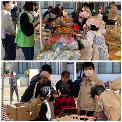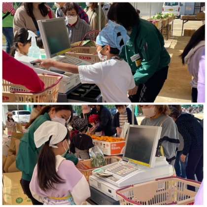 子どもたちがスーパーのレジを担当したり、野菜を売ったりしています。