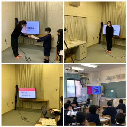 12月6日の児童朝会はいつものように、たくさん図書の本を読んだ人の表彰から始まりました。