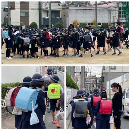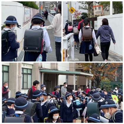 担当の教員が送ります。お迎えに来てくださった保護者の皆様も一緒に連れ添って帰っていただきました。