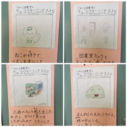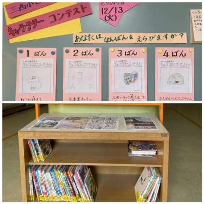 三軒家西小学校の図書室をイメージしたキャラクターを描き、集まったものを掲示しています。