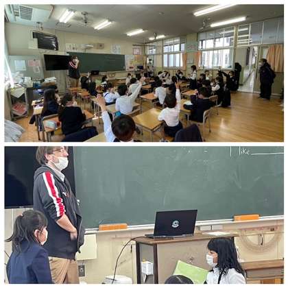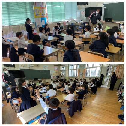 イングリッシュティーチャーと1年生が一緒に学んでいます。