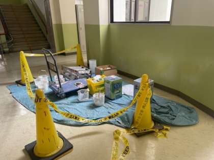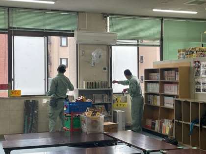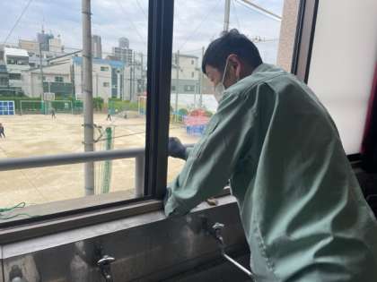 管理作業員の営繕班の皆さんが,窓の外の手すりを塗ってくださっています。