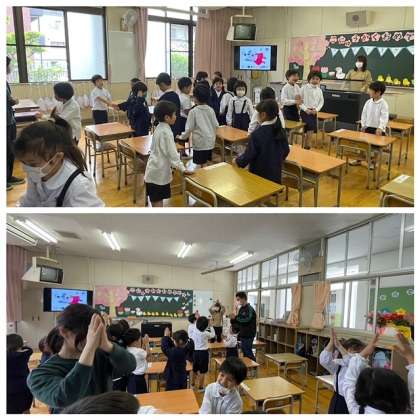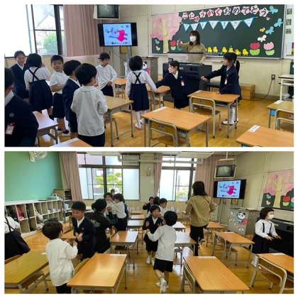 音楽に合わせてグループをつくり、楽しくジャンケンをしていました。
