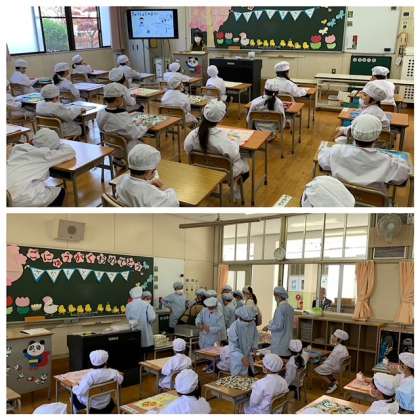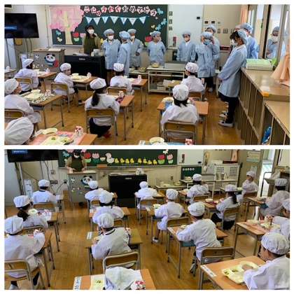 着替えて待っていました。三軒家西小学校のリーダーが,給食を運んで来てくれました。