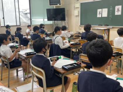 中学年のリーダーになった4年生が習字をしています。