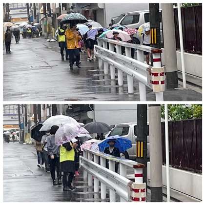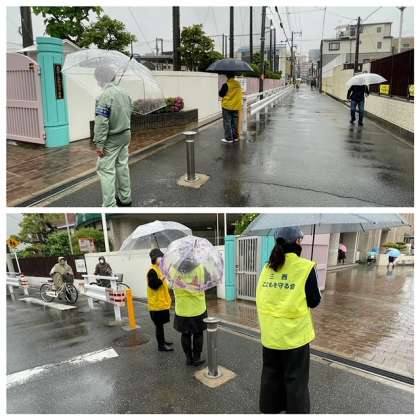 雨が降っている中,保護者の皆様,地域の皆様に見守られ、子どもたちが登校してきました。