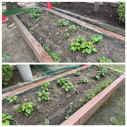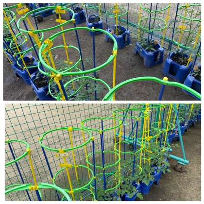 正門の近くには1年生のアサガオがありますが、奥に行くと,2年生のミニトマトとさつまいもがあります。