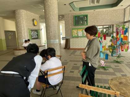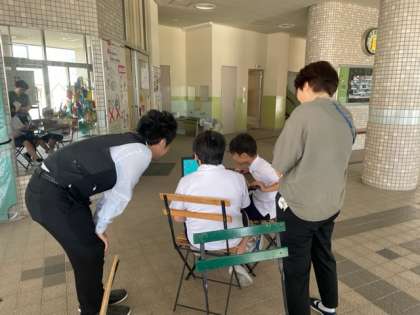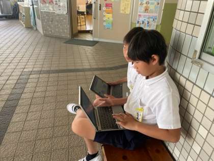 ICT支援員さんが来てくださる日の20分休憩は、ピロティがわくわくタブレットルームに変わります。