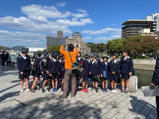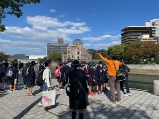 原爆ドームをバックにみんなで写真を撮りました。