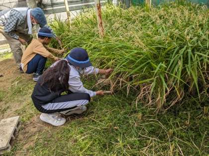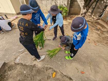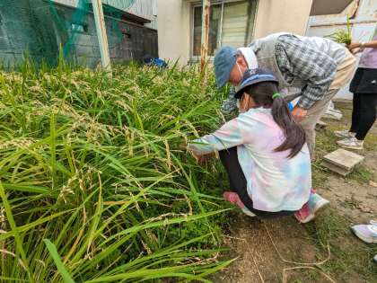 ゲストティーチャーから教えてもらいながら鎌を使って稲を刈り取っていました。
