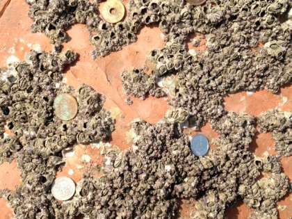 鳥居にはフジツボがびっしりσ^_^;お賽銭が、たくさん落ちていたり鳥居に付けてあったりしました(^-^)