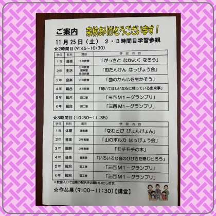 明日25日土曜日は、どうぞみなさまお揃いで,三軒家西小学校へお出かけください。