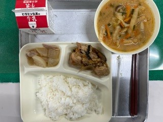 ・鶏肉の甘辛焼きは、鶏肉に料理酒、砂糖、みりん、こいくちしょうゆで下味をつけ、たまねぎを混ぜ合わせ、焼き物機で焼いています。