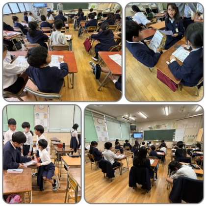 3年生では隣の人やグループで、4年生では、立ち歩いて、自分の意見を伝えたり,友達の考えを聞いたりしていました。