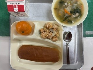 ・スープは、肉だんごと食物せんいの多い押麦、旬のだいこん、ほうれんそうなどを使っています。