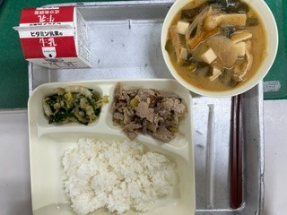 ・給食のだしは、こんぶとけずりぶしでとることが多いですが、今日のみそ汁は、にぼしでだしをとっています。味の違いを感じてみてください。