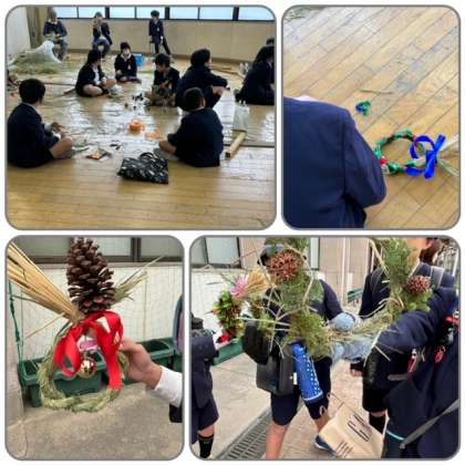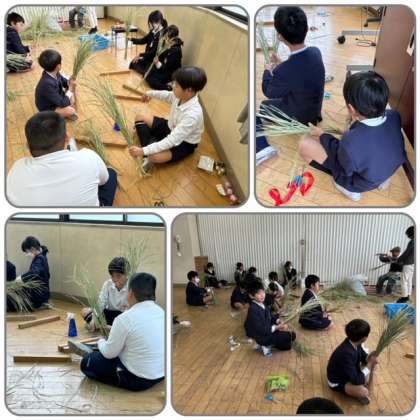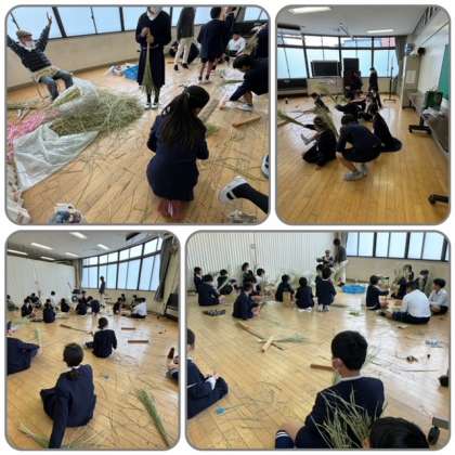 そして、ゲストティーチャーが準備してくださった稲を束ねたものをたたいて、ねじって、丸くしてリースをつくっていきました。