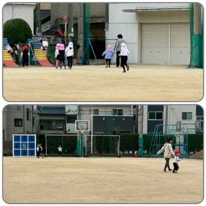 小学生は、13時半の下校なので、三軒家西幼稚園の子どもたちが運動場でいっぱい遊んでいました。