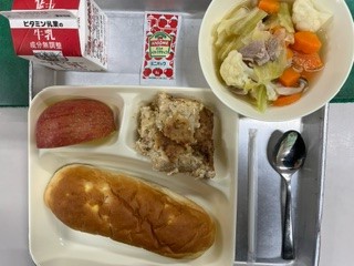 ・とうふローフは、ツナ、でんぷん、たまねぎ、とうふ、大豆、調味料を混ぜ、焼き物機で焼いています。初めて登場する献立です😀