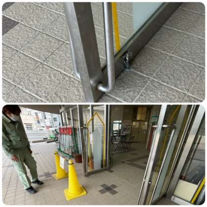 玄関のドアを固定できるように、管理作業員が、ロックをつけてくれました。