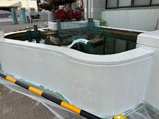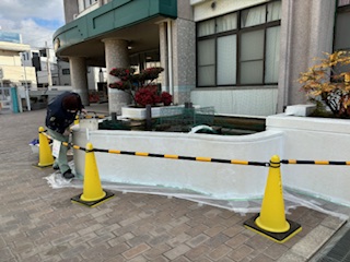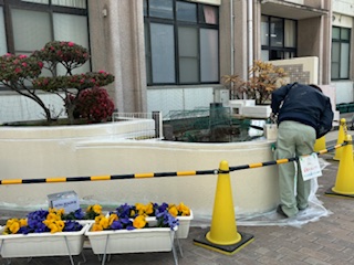 管理作業員が、池の壁をきれいにしていました。