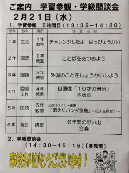 2月21日は,今年度最後の学習参観,懇談会です。