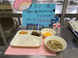 ・卒業祝い献立は、6年生の卒業と1年生から5年生の進級をお祝いする献立です。牛肉のコチジャンいためとさけのカラフルそぼろを手巻きのりにご飯と一緒に巻いていただきます。