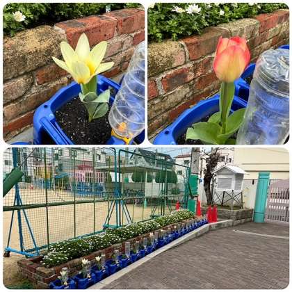校庭には、1年生が植えたチューリップが咲き始めました。