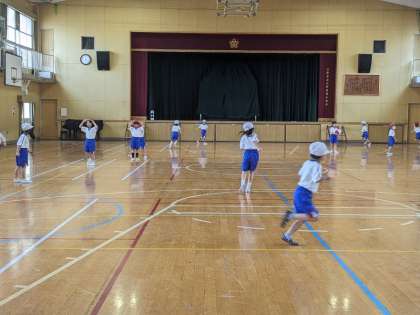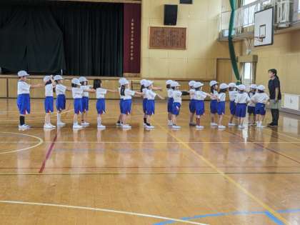 4月15日(月)、1年生が講座で体育を行いました。最初は、並び方です。5月には遠足もあります。素早く自分の場所に並べるか何度か練習しました。その後、「増えおに」をしました。