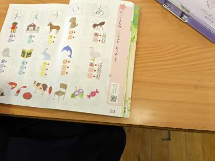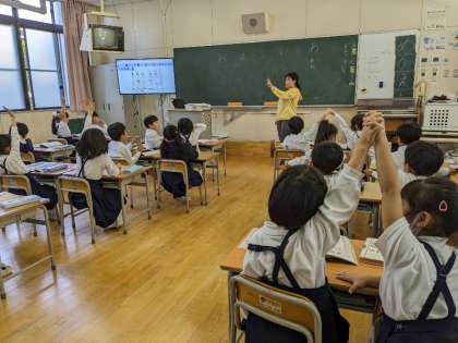 5月9日(木)、1年生は国語科でひらがなの学習をしていました。「え」から始まる2文字は?