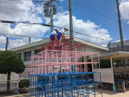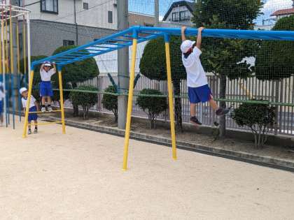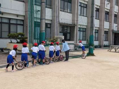 6月3日(月)、1年生は体育科で一輪車、うんてい、登り棒、竹馬に挑戦していました。ジャングルジムにも登ってみました。