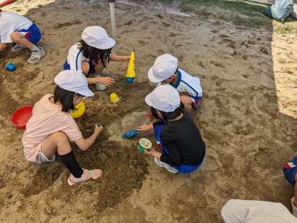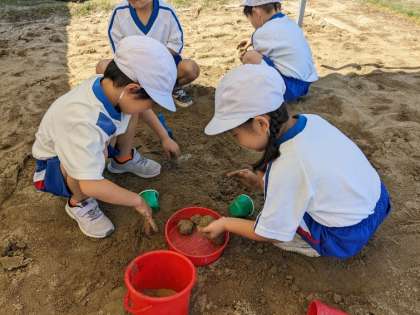 6月7日(金)、1年生は生活科の単元「砂遊び」で砂遊び、水遊び体験をしました。最初は、砂を掘るのも遠慮がちでしたが、途中からどんどん深く掘って、水を流したり、泥だんごを作ったりしました。