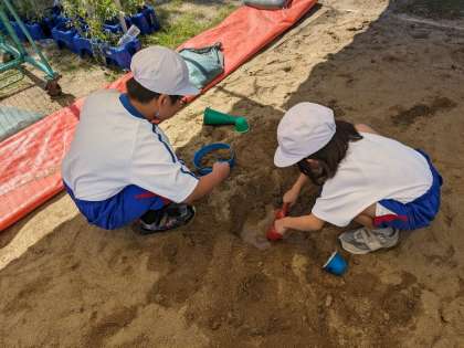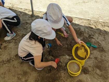 6月7日(金)、1年生は生活科の単元「砂遊び」で砂遊び、水遊び体験をしました。最初は、砂を掘るのも遠慮がちでしたが、途中からどんどん深く掘って、水を流したり、泥だんごを作ったりしました。
