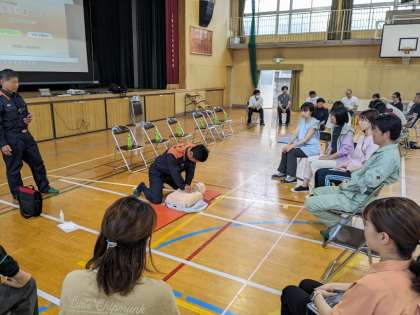 6月9日(日)、日曜授業、引き渡し訓練の後、午後から教職員、PTA役員、実行委員の皆さまと救急救命講習を行いました。