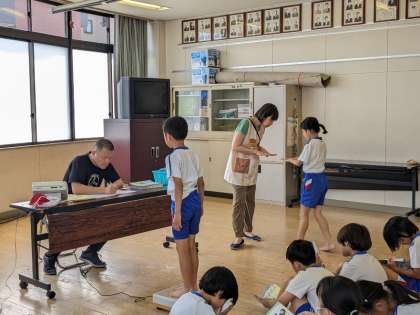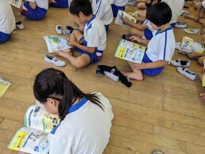 6月11日(火)、4年生は体重測定をしていました。最初に養護教諭から熱中症について、話がありました。測って待っている間もしっかり本を読んでいます。