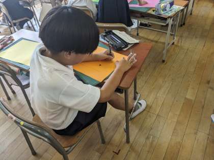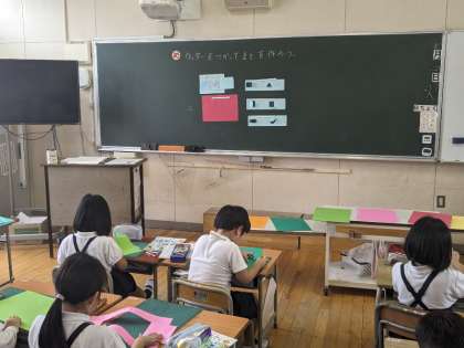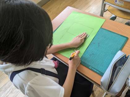 7月2日(火)、2年生はカッターを使って画用紙を切り、窓になるようにしていました。切れた児童から絵を描いていました。