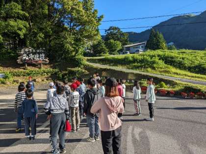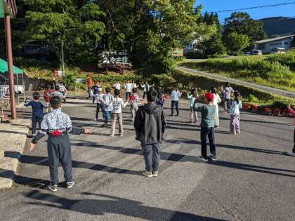 「エビカニックス」の曲に合わせ、体操をしました。これで目覚めはバッチリです。