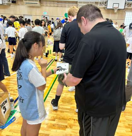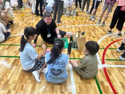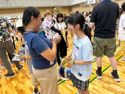 8月1日(木)、中之島小中一貫校の体育館で、5・6年生向けの英語体験イベント「イングリッシュデイ」がありました。