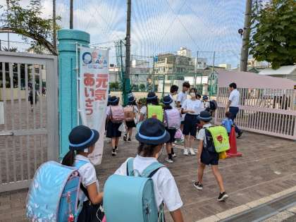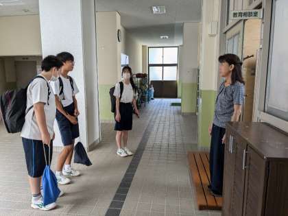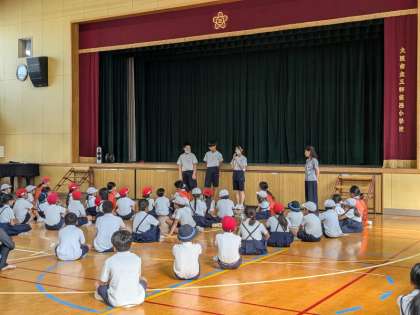 9月5日(木)、大正東中学校より3名の生徒が職場体験に今日と明日、小学校に来ています。朝、校長先生に挨拶し、正門に立ったあと、児童集会で皆に紹介しました。学校の先生の仕事のことをしっかり学んでほしいです。