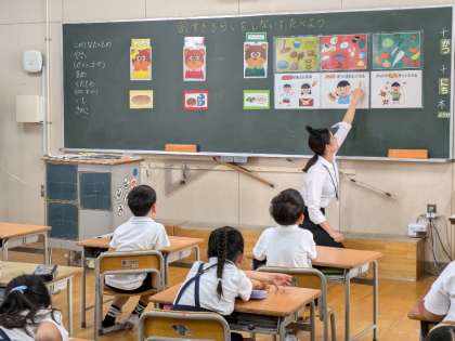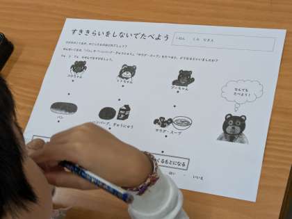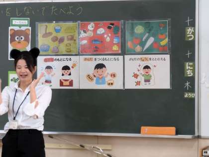 10月10日(木)、1年生では栄養教諭の先生が来られ、「すききらいをしないでたべよう」のめあてでお話がありました。