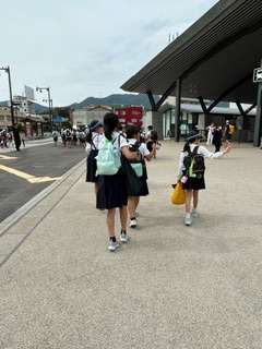 フェリーが宮島口について、駅へ向かって歩き出すと、子どもたちから