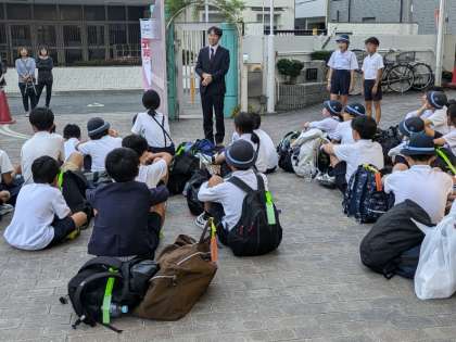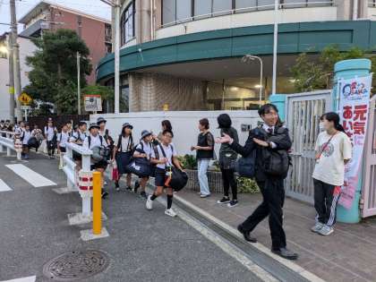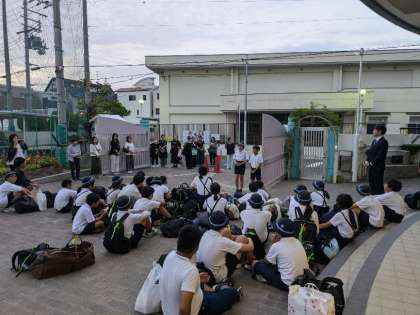 学校のリーダーが広島修学旅行から帰ってきて帰校式を行いました。