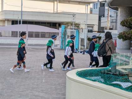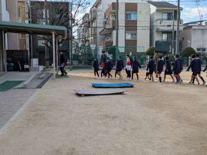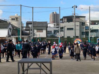1月17日(金)、避難訓練を行いました。三軒家西幼稚園の幼児たちも学校に避難しました。