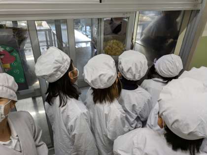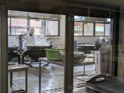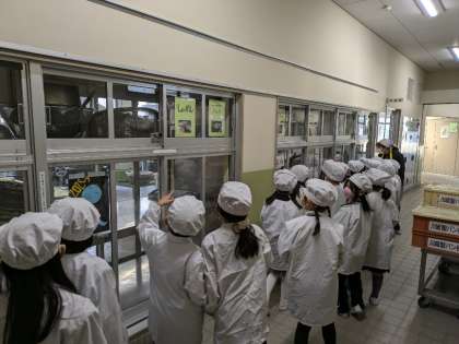 1月23日(木)、1年生から3年生は給食室へ調理の様子を見学に行きました。毎年、給食週間の時に行っています。本校では約190食の給食を作ってくださっています。